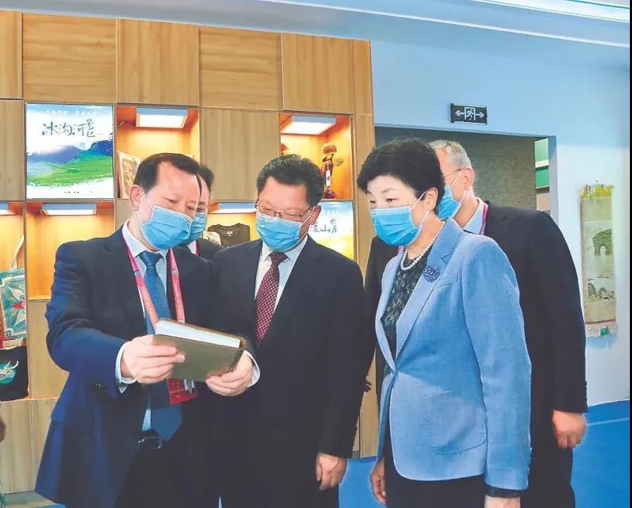 9月24日上午,省委书记、省人大常委会主任尹弘在参观商品展时,与市委书记柳鹏亲切交谈。