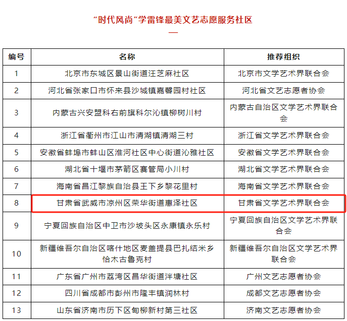 其中,武威市凉州区荣华街道惠泽社区被评为“时代风尚”学雷锋最美文艺志愿服务社区。